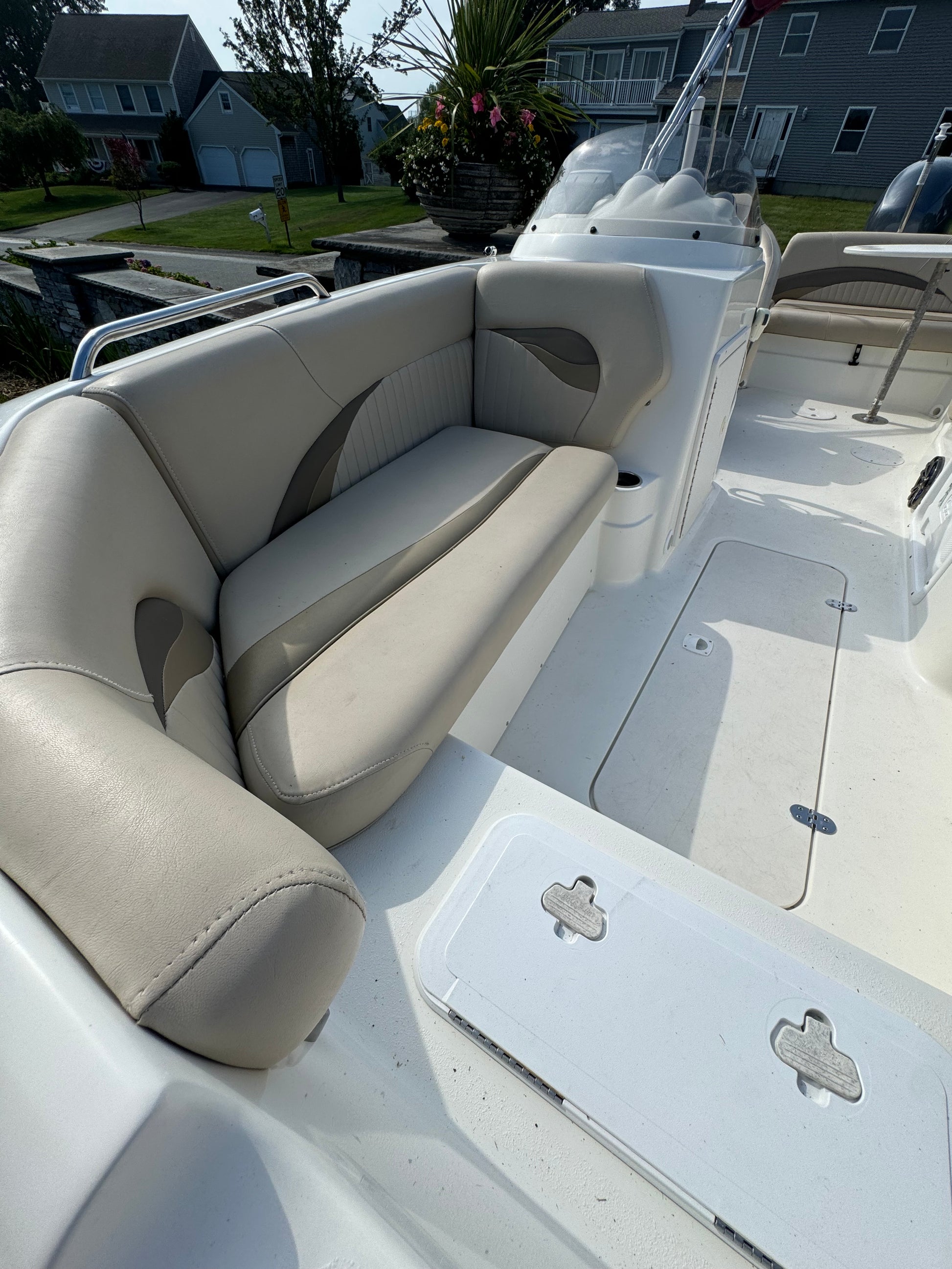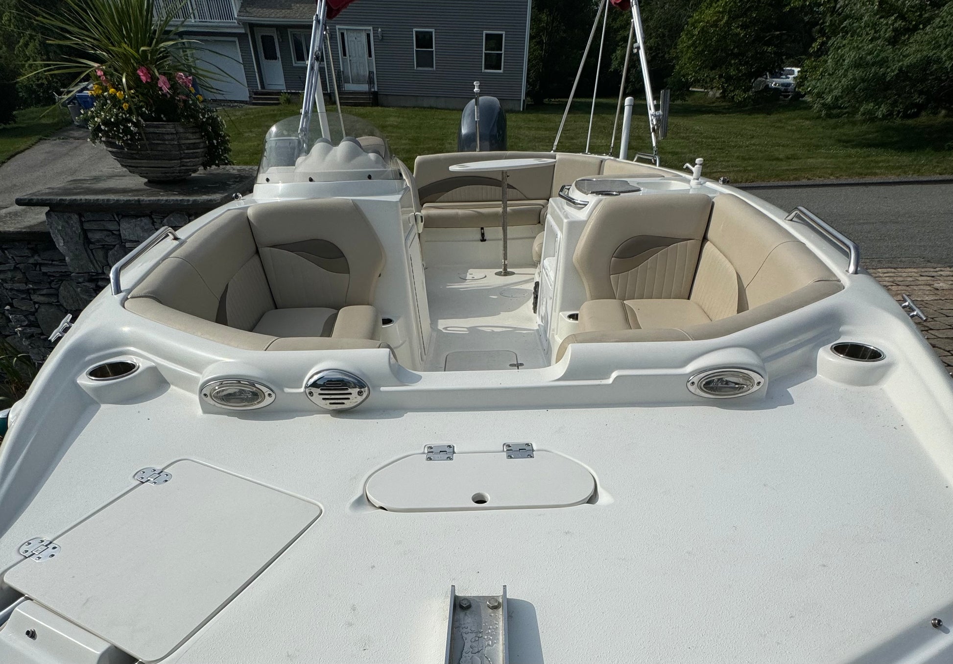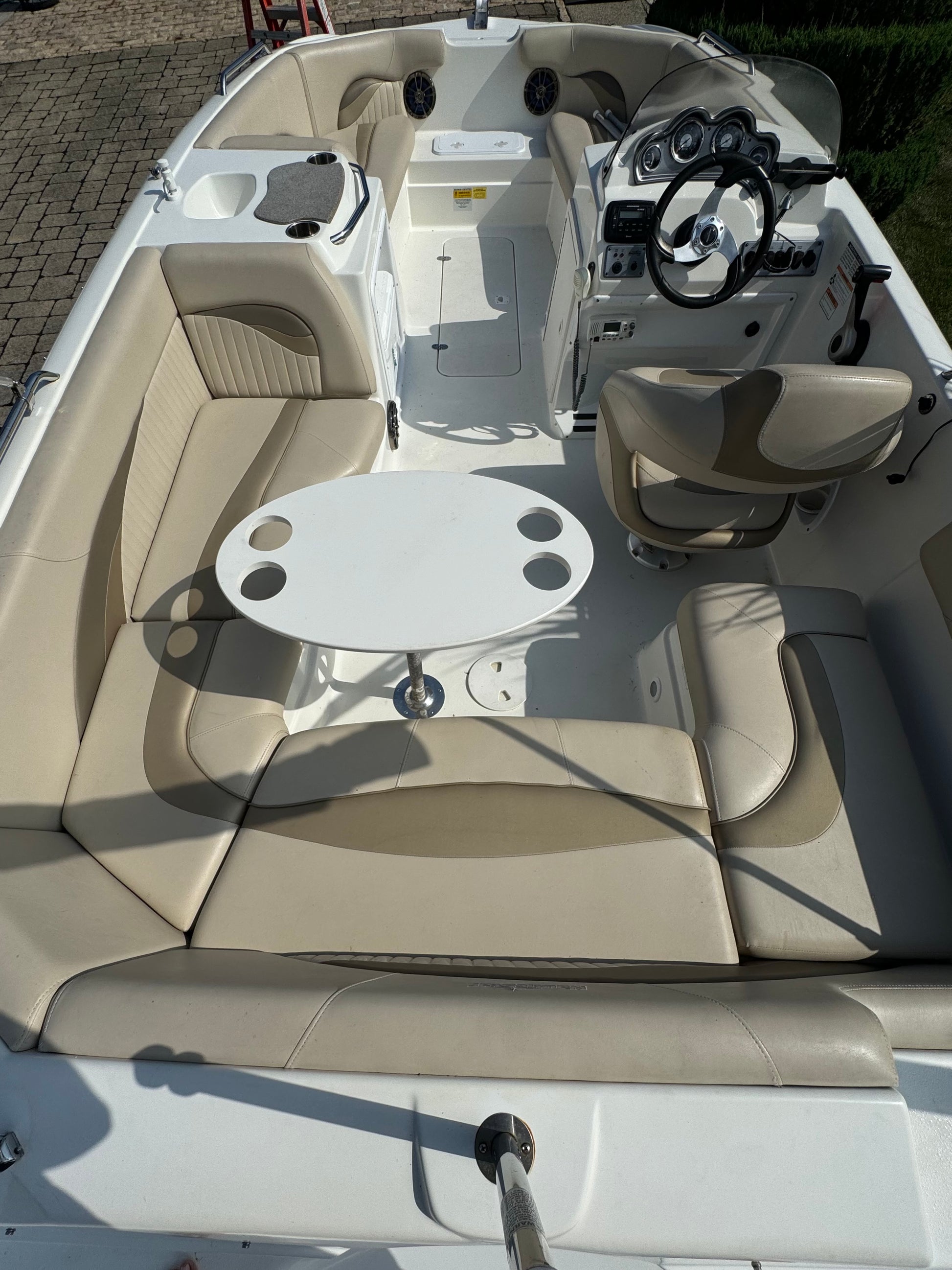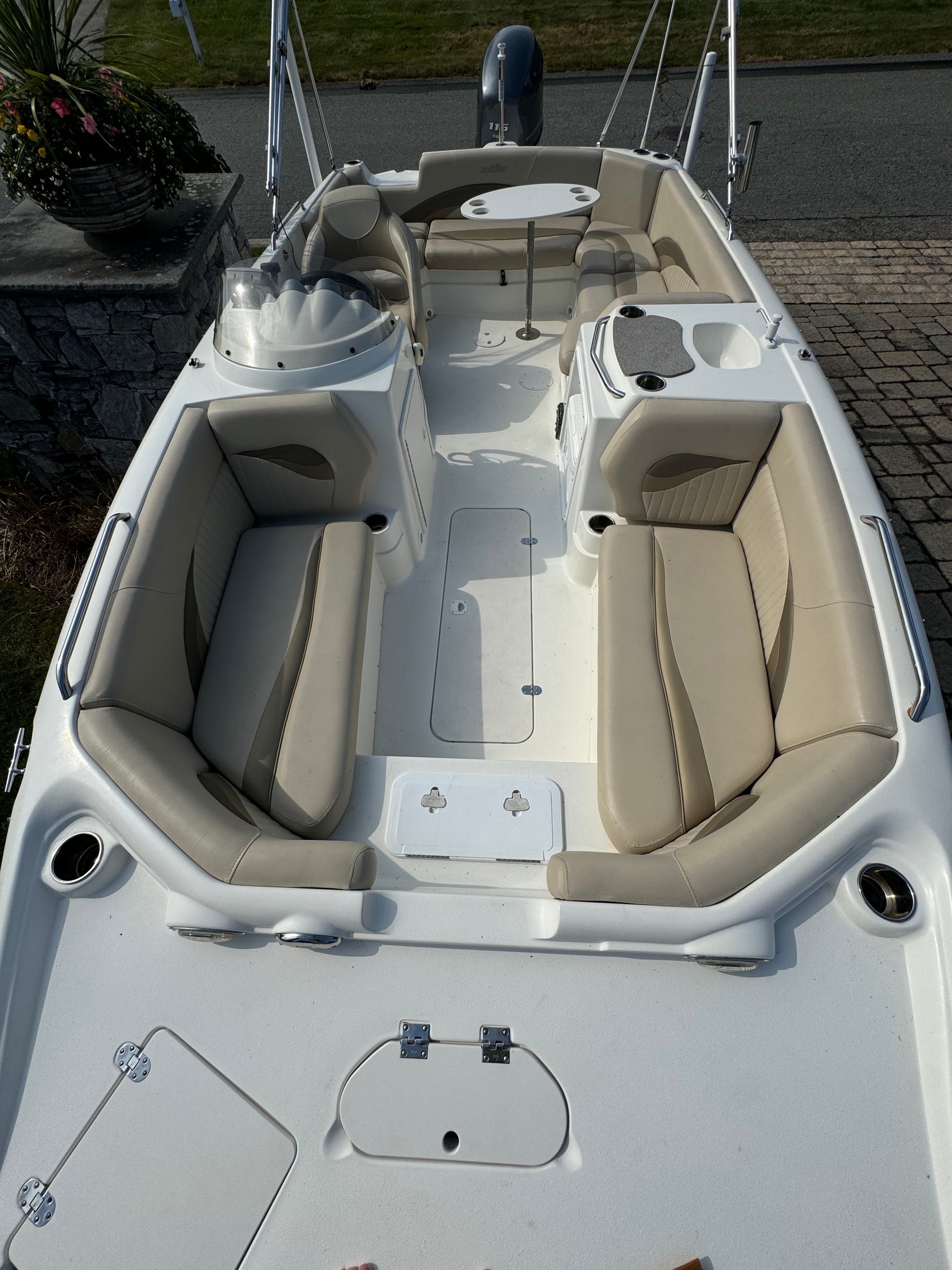 All of this and more….she has a Garmin GPS, Bimini top, Sink with cooler, Cockpit table, Stereo System, VHF and is sitting on a double axle trailer. She is in excellent shape for her age so give us a call!